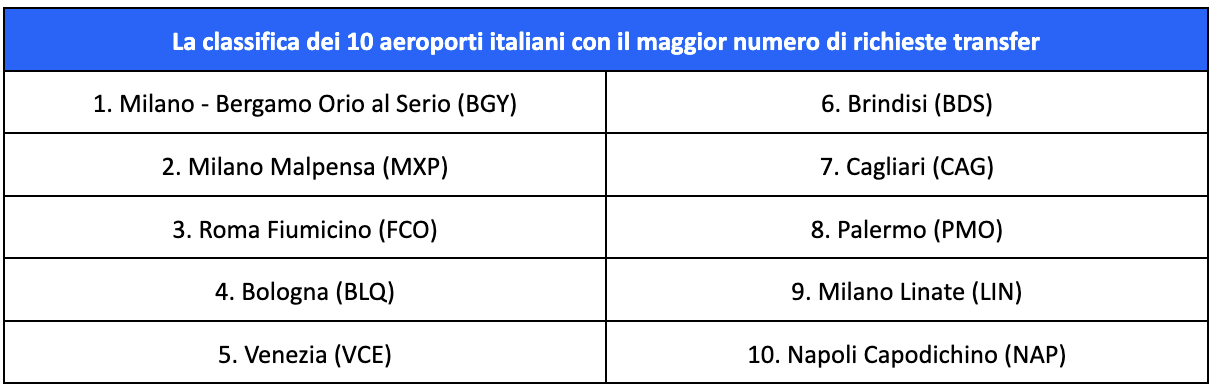 A dominare la scena sono stati principalmente i transfer verso gli aeroporti di Bergamo Orio al Serio (17%), Milano Malpensa (15%) e Roma Fiumicino (10%), per i quali si è concentrata la maggior parte delle richieste; i tre confermano così il podio 2023, ma con lo scalo bergamasco che nel 2024 supera quello varesotto, lo scorso anno al primo posto.