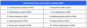 Seguono quelli che si occupano di pulizie, in particolare di materassi (+33%), pavimenti (+27%) e vetri e finestre (+22%), sintomo del bisogno di rinfrescare le case dopo mesi di freddo e umidità. Completano la classifica i servizi legati alla rimozione di muffe, alla cura del giardino, all’allontanamento dei piccioni, allo sgombero delle cantine e alla pulizia dei condizionatori.