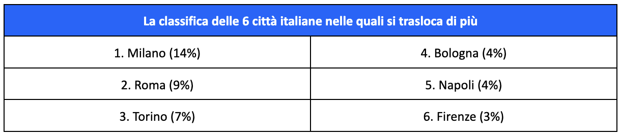 In un mondo in continua evoluzione e dove il caro affitti e case pesa sempre di più sul portafoglio, aumenta il numero delle persone che decide di traslocare per trovare una soluzione più adatta alle proprie esigenze, che siano lavorative, economiche o di spazio. A evidenziarlo è l’analisi* condotta da ProntoPro, il marketplace di riferimento per i servizi professionali che mette in contatto domanda e offerta, dalla quale emergono inoltre le città italiane nelle quali si trasloca di più: Milano (14%), la più cara in Italia per gli affitti, con un costo medio al metro quadro di 22,90€, che arriva a 5.340€ per l’acquisto; Roma (9%) e Torino (7%). Seguono Bologna, Napoli e Firenze, con l’emiliana e la toscana che affiancano sul podio delle città con l’affitto più costoso il capoluogo lombardo: rispettivamente 19,80€ e 18€ al metro quadro.